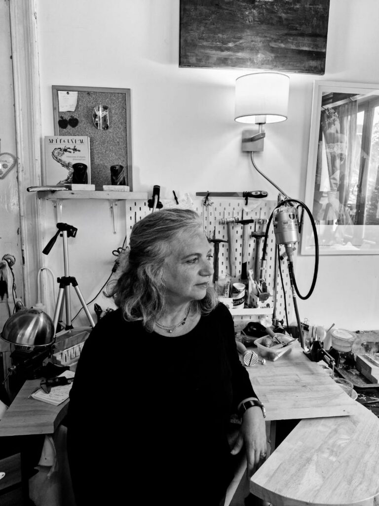 Dans son atelier bruxellois, elle travaille les métaux précieux et des pierres naturelles entièrement à la main. Formée en gemmologie, elle aime proposer, à côté des pierres traditionnelles, des gemmes moins connues qui invitent à découvrir de nouveaux trésors.