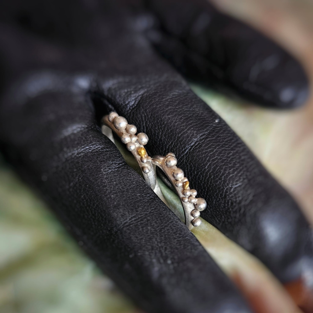 Réalisée entièrement à la main, elle marie un corps de bague en argent 925 à de fines billes en argent et or, qui ajoutent un point de lumière subtil. Ce contraste de matières offre une présence naturelle, élégante et intemporelle.